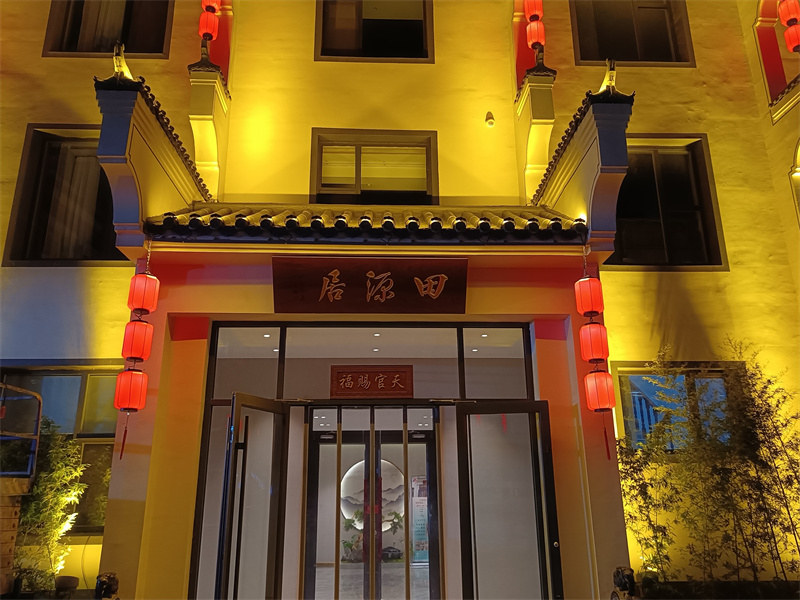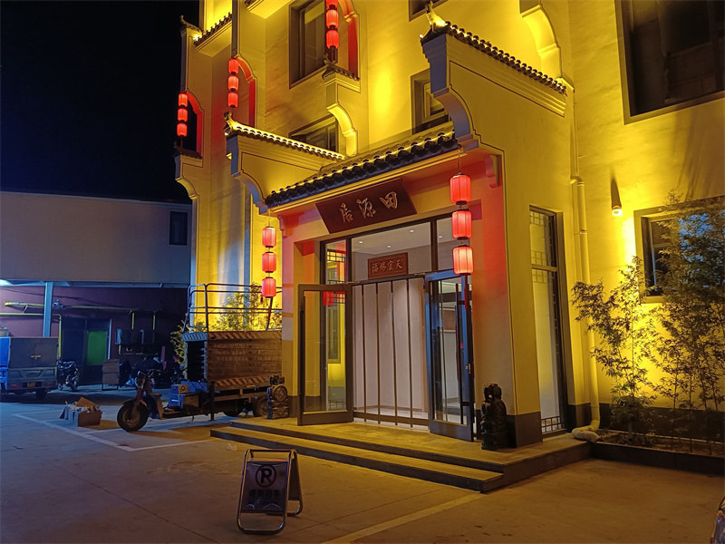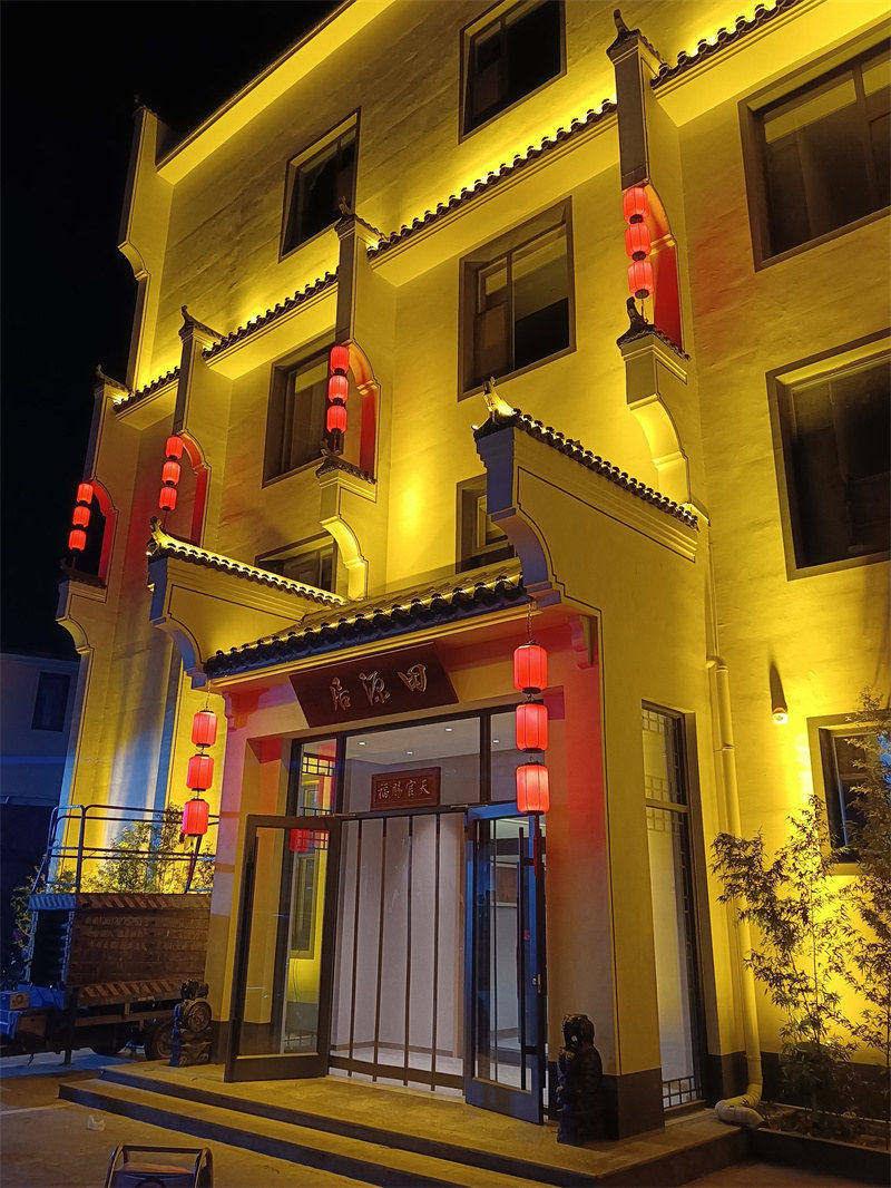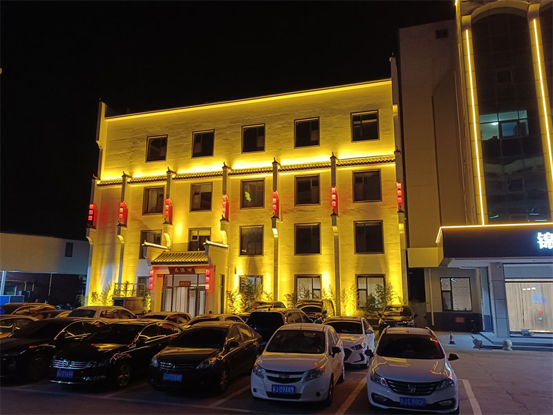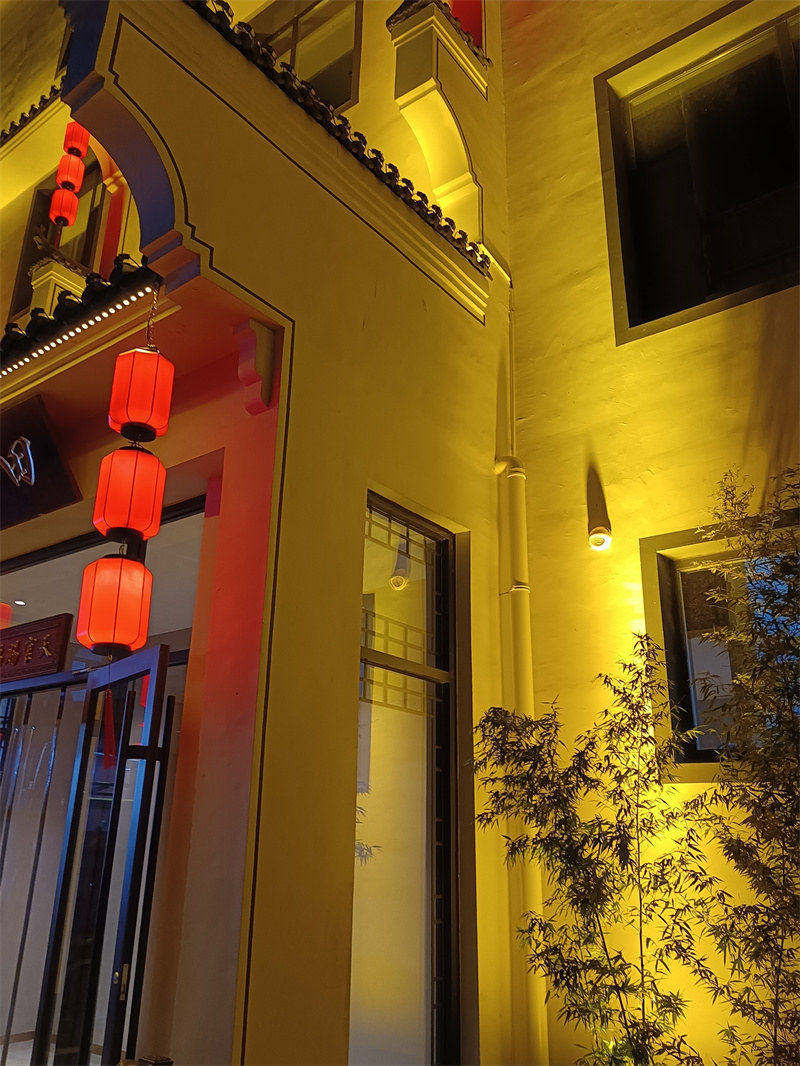 项目简介:项目位于河北省沧州市盐山县,酒店本身为白墙灰瓦的徽派风格,崇尚简洁,不适合安装过多的灯具影响百天的效果,因此,我们仅在瓦檐部分安装瓦楞灯,地面部分安装投光灯,瓦与墙面的结合部分安装洗墙灯,并在马头墙处安装了红色的灯笼。